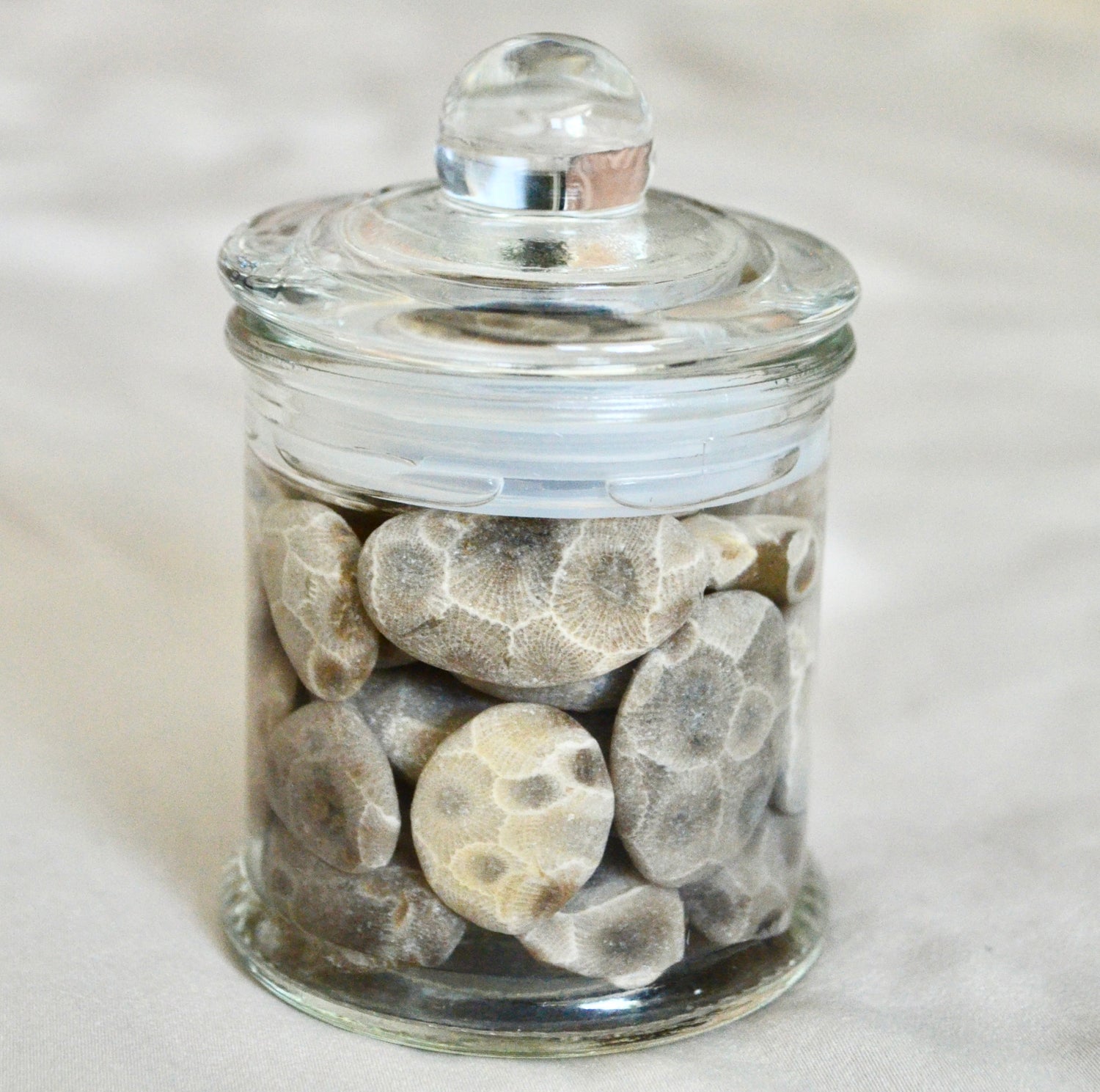 We offer beautiful Michigan Petoskey stones in unique little display jars...